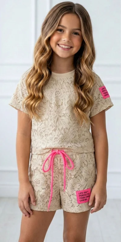 Deze trendy zomerse kanten meisjes set bestaat uit een stijlvolle top en een bijpassend shortje met opvallende neon roze details. De kanten stof geeft de outfit een elegante look, met leuke speelse en moderne label details.